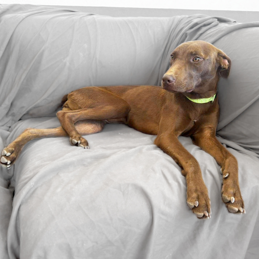 Gabby is no longer a tiny puppy — she’s a few months older now and starting to show exactly what kind of dog she’s going to be. With her rich chocolate-brown coat, long legs, and soft, expressive eyes, she turns heads — but it’s her sweet nature that really stands out.
