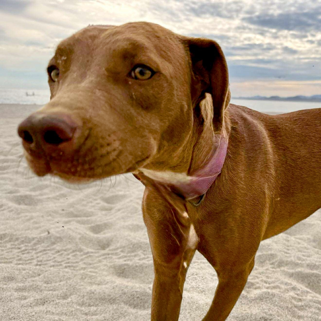 Canella (Queenie) is a sweet, smart, and loving 9-month-old girl. She can be a little shy at first, but once she warms up, she’s incredibly affectionate. She loves beach walks, playing in the water, and is learning quickly with her training.