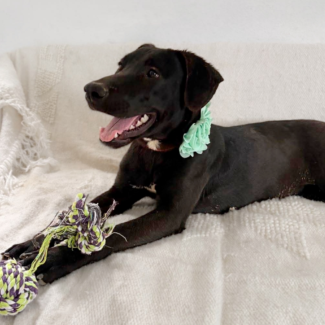 Donut is a sweet young puppy with a soft heart and trusting eyes. She’s slowly realizing that she’s safe now — and that people mean kindness, warmth, and care. As she continues to heal, she’s starting to show her gentle, playful side.
