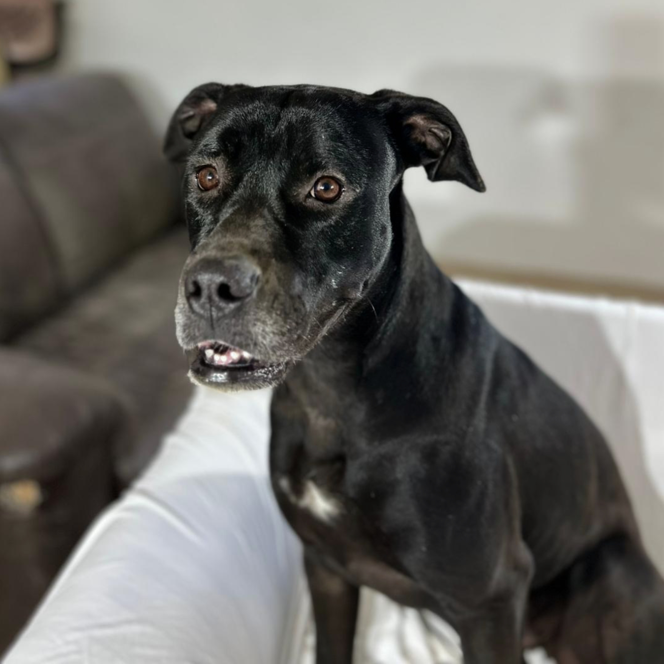 Zarah is the kind of dog people stop and notice. Beautiful short coat, expressive face, the cutest little front "teef" and a presence that draws you in. But what really matters is who she is when the moment quiets down — a gentle, affectionate dog who just wants to belong to someone.